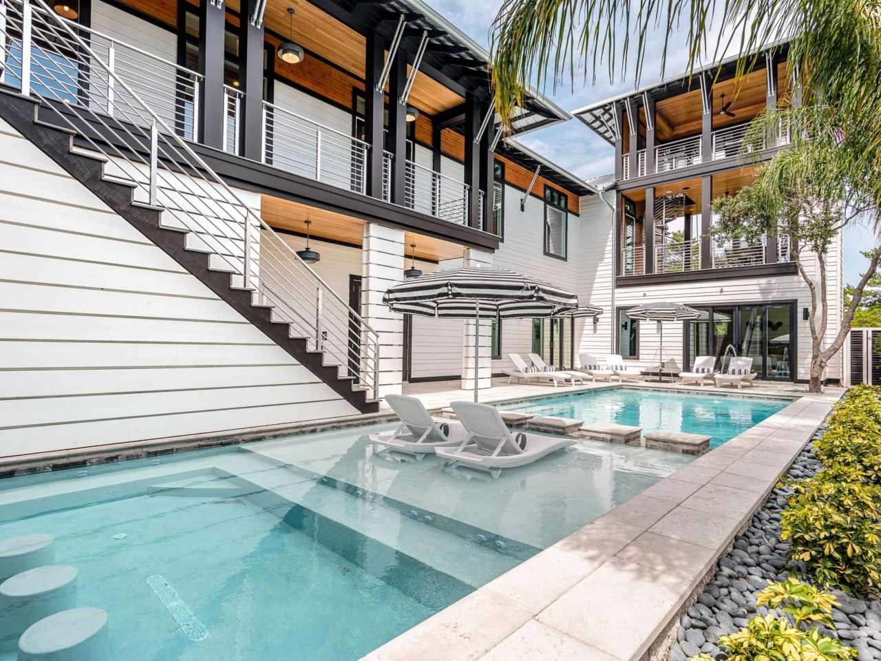 This iconic Dune Allen residence is equal parts private coastal retreat and enviable vacation destination. The home blends architectural artistry with professionally designed interiors to create a modern masterpiece that balances rustic warmth with contemporary style. Inside, a lavish kitchen with Wolf appliances and a 12-ft. Luke Langford dining table anchors the open floor plan, while a dramatic concrete fireplace adds character to the living space. Large windows flood every corner with natural light and frame tranquil views. Five suites, two bunk rooms, two laundry rooms, and multiple common areas make the home ideal for large family gatherings or group getaways. Step outside to a private courtyard where the pool and spa are enhanced by fountains, a sun shelf, and swim-up seating. Porches on every level invite moments of relaxation, from a grilling porch off the kitchen to a cozy sleeping porch with fireplace. The watchtower lounge crowns the home with sweeping panoramas. A two-car garage with climate-controlled storage adds convenience for long stays. Perfect for entertaining or unwinding, this home also shines as a vacation rental, sleeping up to 22 guests. The outdoor oasis features a summer kitchen with built-in grill, poolside smart TV, mini fridge, table tennis, spa and a pool with optional heater. Just a two-minute stroll to the beach, owners and guests alike will enjoy parking, services, and easy access to the best of 30A.Just steps away, the Dune Allen beach access offers over 220 feet of pristine beachfront with restrooms for convenience and a lifeguard station for added peace of mind.